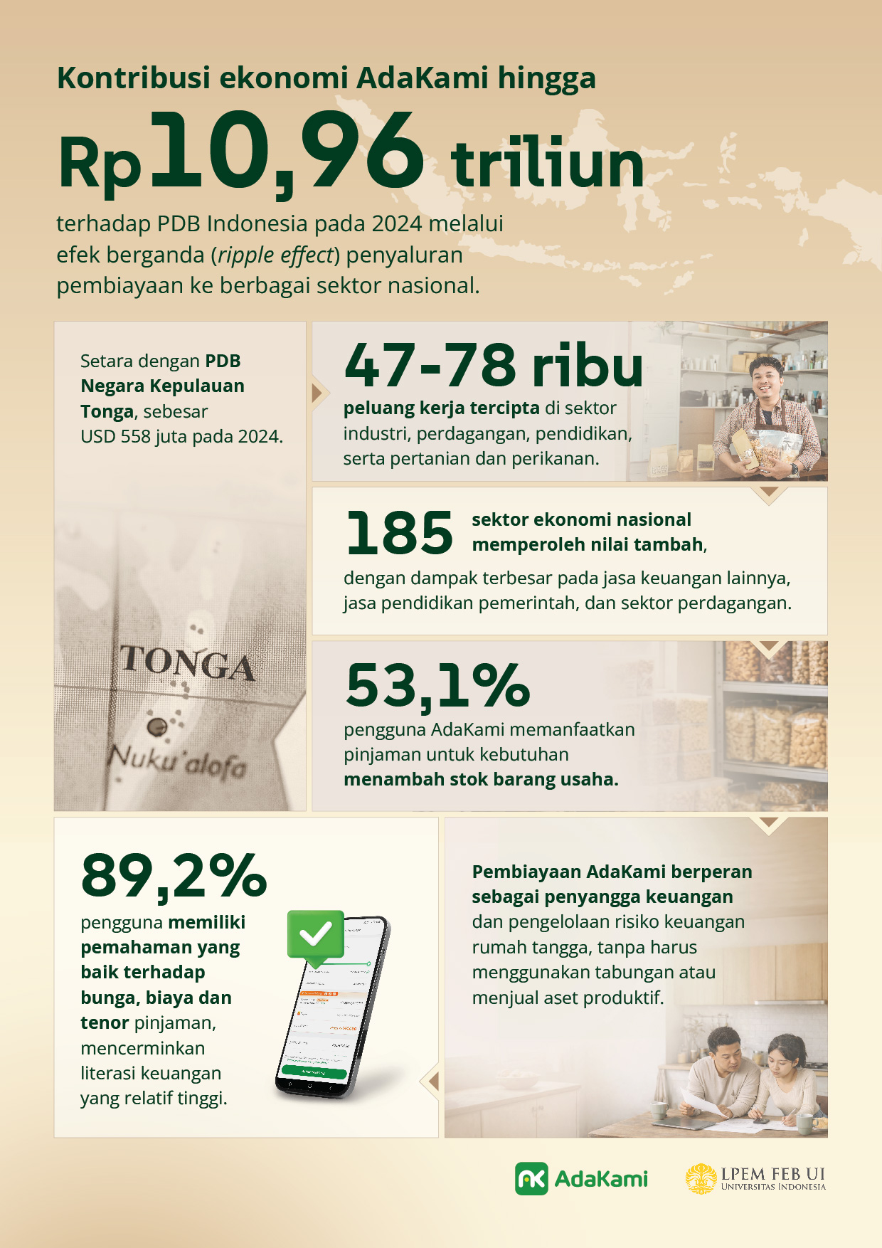 Sebagai gambaran, angka kontribusi tersebut setara dengan seluruh PDB negara kepulauan Tonga pada 2024 yang tercatat mencapai Rp 9,38 triliun. Ukuran ini mencerminkan betapa besar perputaran ekonomi yang digerakkan oleh pembiayaan AdaKami.