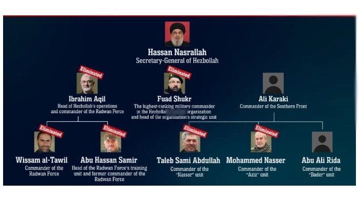 Tentara Israel (IDF) menerbitkan rantai kepemimpinan militer Hizbullah, yang dipimpin oleh Sekretaris Jenderal Hassan Nasrallah, dan menandai nama-nama pemimpin yang berhasil dibunuh.