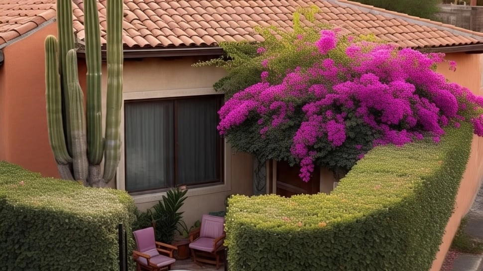 Desain rumah anti maling. (Dibuat dengan Meta AI)Tanaman seperti kaktus besar, bambu Jepang, atau semak berduri (seperti bougenville) bisa dijadikan sebagai pagar alami di samping atau belakang rumah. Selain cantik, tanaman ini menyulitkan orang asing untuk masuk ke area rumah.