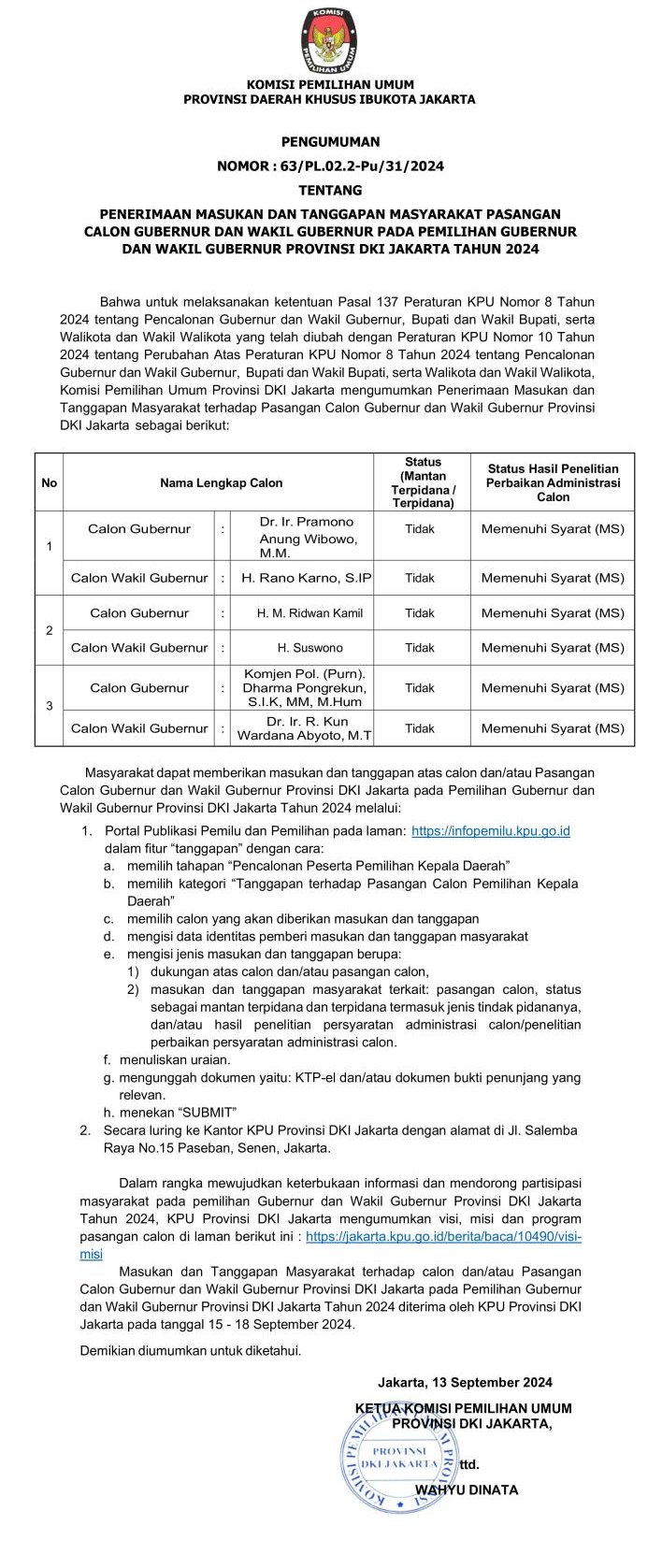 Berdasarkan pengumuman tersebut, tiga pasangan calon yang dinyatakan memenuhi syarat adalah Pramono Anung Wibowo dan Rano Karno, Ridwan Kamil dan Suswono, Dharma Pongrekun dan Kun Wardana Abyoto. Tidak ada di antara mereka yang memiliki status mantan terpidana maupun terpidana.